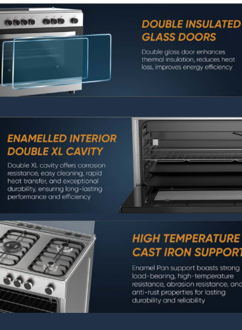 Built with auto-ignition for safety and ease of use, and equipped with heavy-duty cast iron pan supports, this cooking range ensures stable, secure cooking for all cookware types. Its stainless steel finish not only adds a premium look but also makes cleaning effortless.